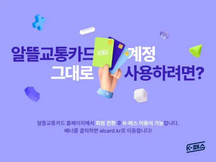 - 단, 알뜰교통카드에서 K 패스로의 회원 전환은 앱에서 2024년 4월 30일까지, 알뜰교통카드 누리집 홈페이지에서 2024년 6월 30일까지 할 수 있습니다. K 패스로 회원 전환을 했다면 K 패스 앱으로 업데이트 후 알뜰교통카드 계정으로 로그인 해야합니다.(자동로그인 불가능)