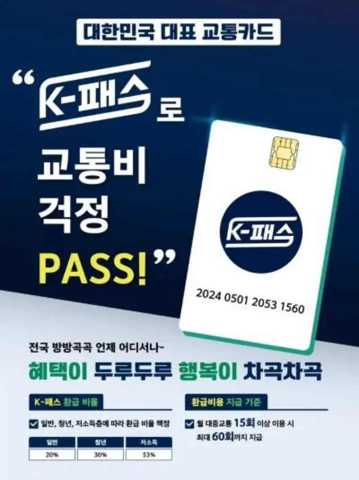 K 패스(케이패스)는 정부에서 진행하는 대중교통비 환급 지원사업으로, 한 달에 대중교통비로 평균 7만원을 교통비로 지출할 때 연간 17만 원에서 최대 44만 원까지 환급 받을 수 있습니다. 아래 내용 확인 하시고 빠르게 신청하셔서 혜택 받아 가시기 바랍니다.